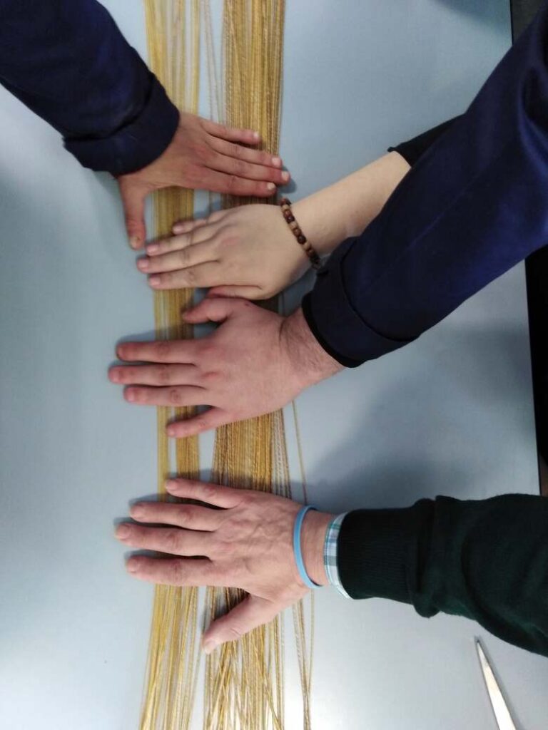 Las tiras se enrollan y torsionan de forma manual, aplicando la cantidad exacta de giro para conseguir una cuerda compacta, resistente y de comportamiento estable. El nivel de torsión influye en el timbre: